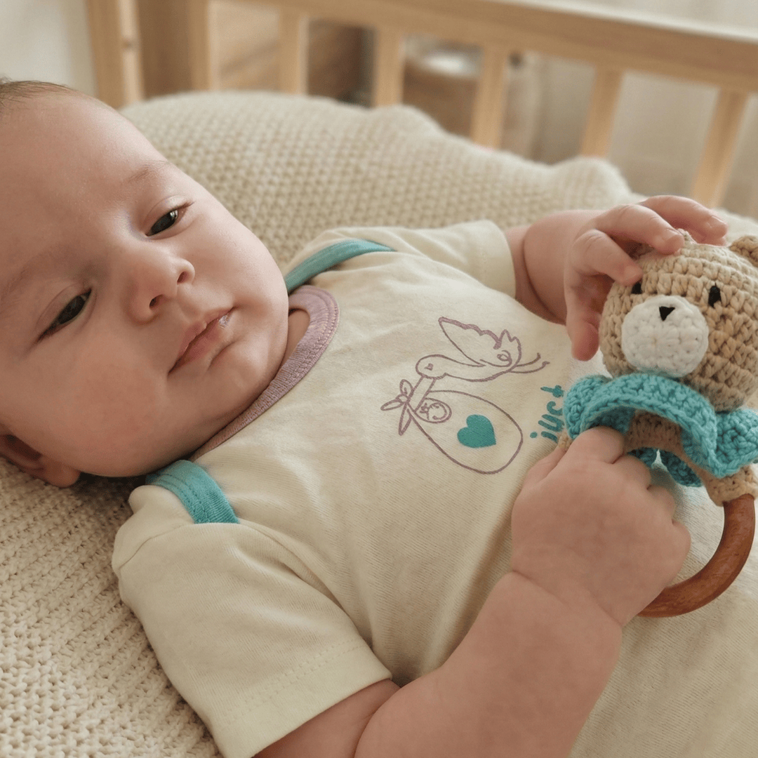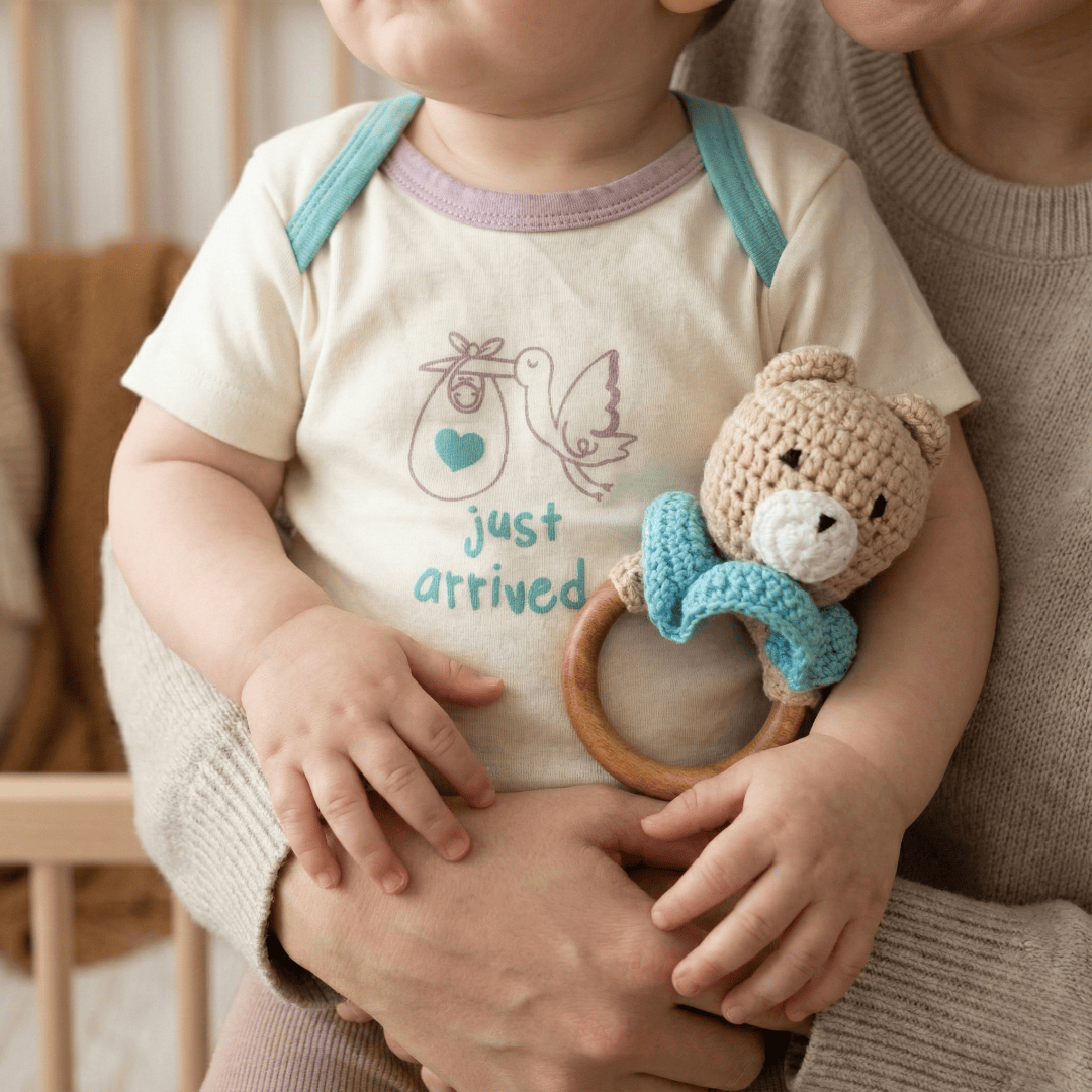 The Just Arrived Hamper is a sweet 2-piece set designed to celebrate a baby’s very first days with warmth and love. It includes a soft 100% cotton “Just Arrived” baby t-shirt (3-6 months) that is gentle on delicate skin and perfect for those first adorable photos, paired with “Tumble”, a hand-crocheted teddy rattle toy crafted with care for little hands to hold and hearts to cherish. Thoughtful, minimal, and timeless - a perfect keepsake gift to welcome a newborn home.