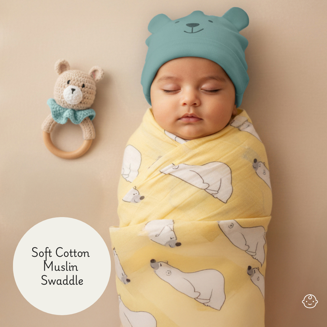 The Little Looker Hamper is a heartwarming 6-piece gift set for newborns, curated to wrap your little one in pure cotton comfort and handmade charm. It includes: